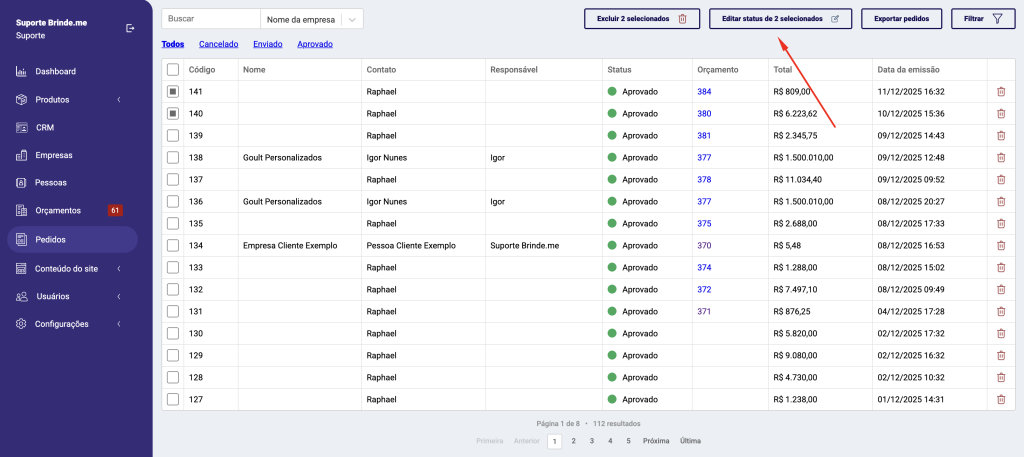 Você pode atualizar o status de vários pedidos de uma só vez.