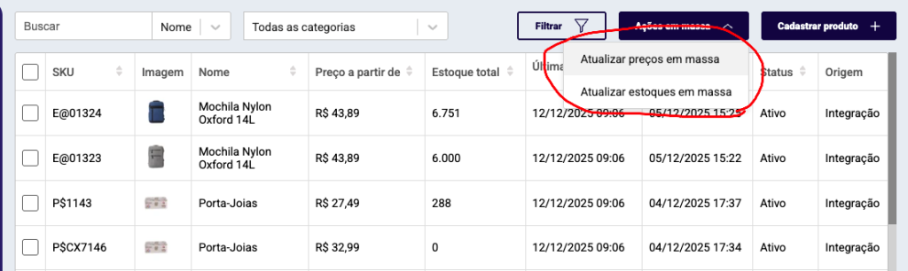 Atualização de Preço e Estoque em Massa para Produtos Cadastrados Manualmente